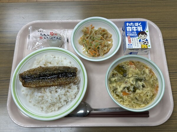 ・さんまのかば焼き丼 ・ごま酢和え ・むらくも汁 ・みたらし団子 今日はお月見の献立でした。 お月見は、秋のきれいな月を眺めながら収穫への感謝を伝える行事です。昔から、豊作を祈ってお団子や秋の食べ物をお供えする風習があります。脂ののった秋刀魚には、たんぱく質やDHA・EPAが豊富です♫