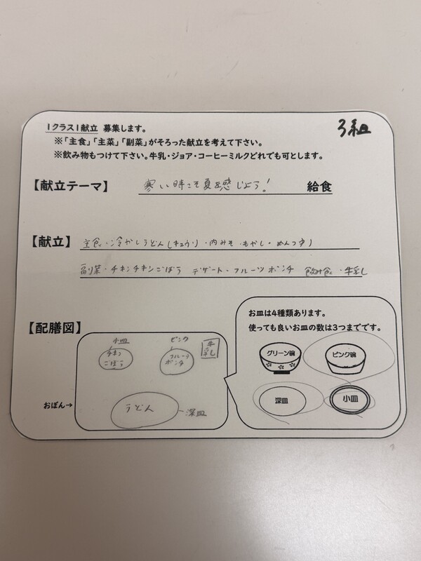 ・冷やし肉味噌うどん ・チキンチキンごぼう ・フルーツポンチ 今日は3組のリクエスト給食でした。献立のテーマは「寒い時こそ夏を感じよう!給食」。 給食室もかなり冷え込んでいたので、夏場よりもキンキンに冷えた仕上がりになりました。のどごしも良かったですね。 学級閉鎖のクラスやお休みも多い中、よく食べてくれていました。